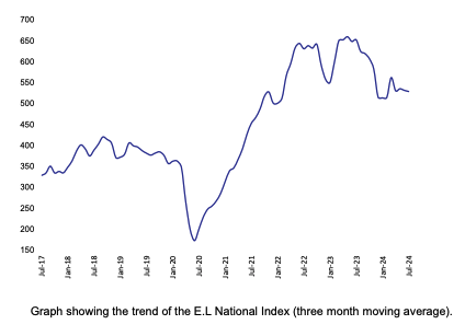 The E.L Index fell 7 per cent in July to move to its lowest point, apart from the Christmas slowdown, in three years.
