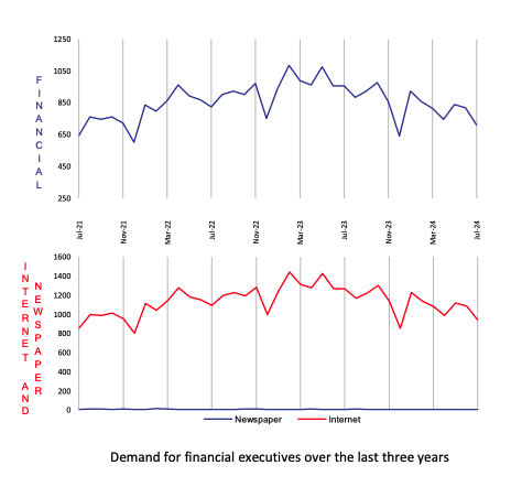 In the business sectors, demand in Australia in July for executives saw significant falls in Financial, Engineering and Information Technology across senior management positions in the business and government sectors.