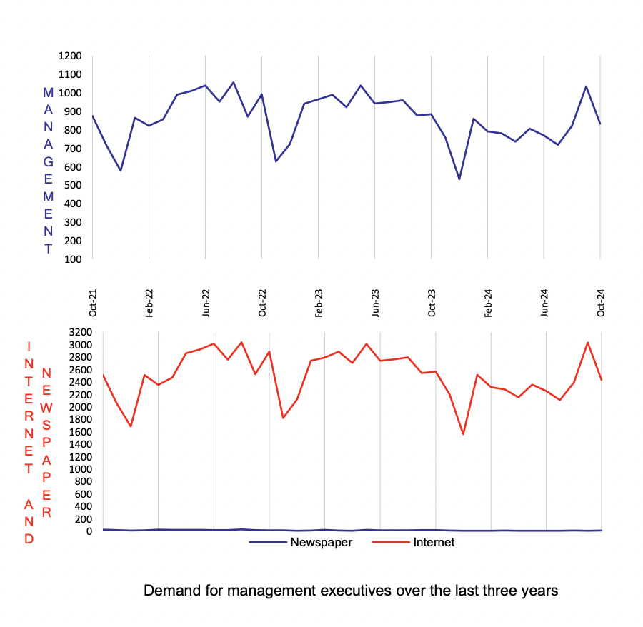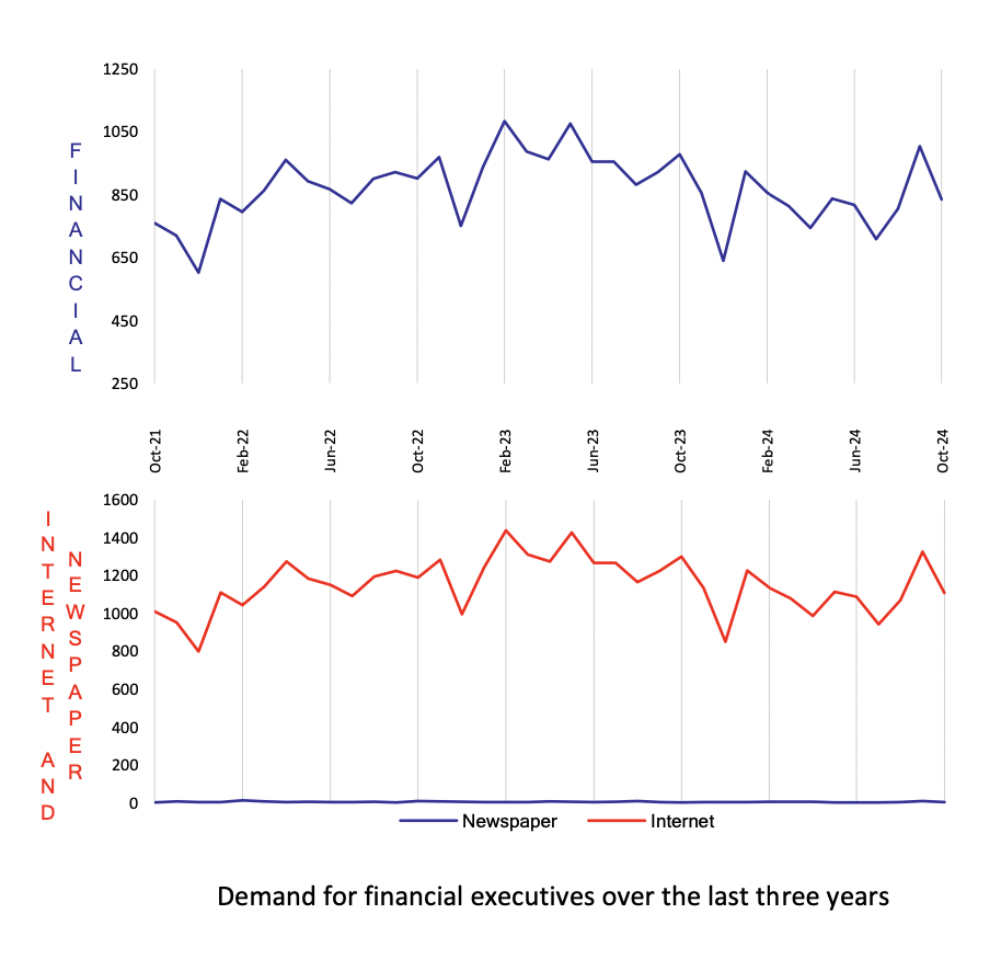 The National and specific career group Indexes are shown as relative indexes recording the monthly demand activity for executive positions in the current month against the demand in a historical base period which is normalised to 100. The historical base period used was the average of the last quarter of 1992 which research showed to be the bottom of that downturn.