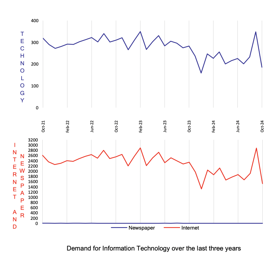 Among the sectors, Information Technology led the way lower with its 47 per cent slide, followed by Marketing and Management. Government sector retractions played a large role in the overall decreases.